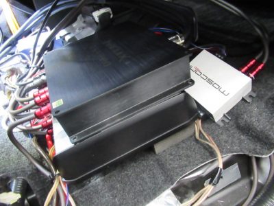 助手席シート下にJLアンプの上にへリックスDSPにモスコニアンプ