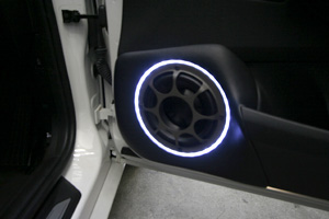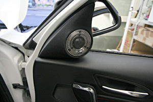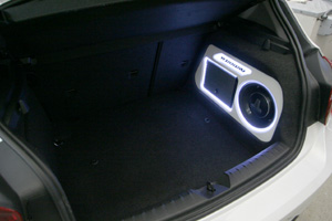 荷物スペースを確保するため、ラゲッジスペースサイドにアンプ&サブウーハーをインストール。フロントスピーカーはドア、ツイーターはドアミラー裏に埋込みインストール。