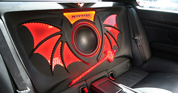 リアエリアを外装ステッカーと合わせて加工処理、サブウーハーをイルミネーションとデザインインストールしています。