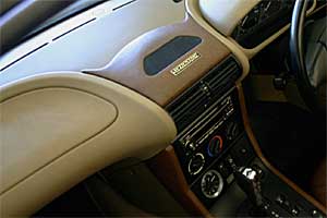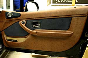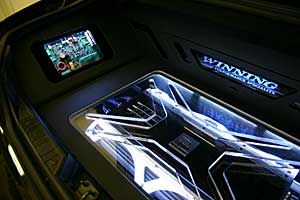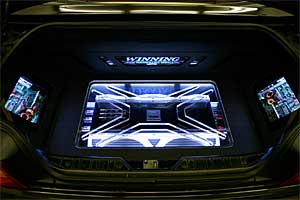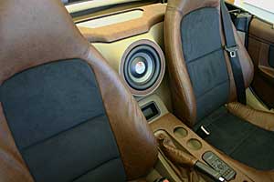ドア、シートなどをレザーで内装を張り替え。フロントコンソールから、リモコン、ドリンクホルダー、サブウーファーまで非常に統一されたデザインです。(幌もシートと同じカラーに張り替えています) トランクスペースはアンプ、キャパシタがネオンで照らされています。