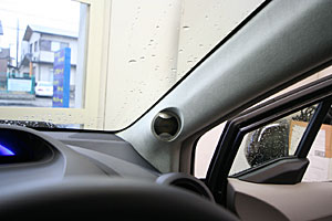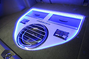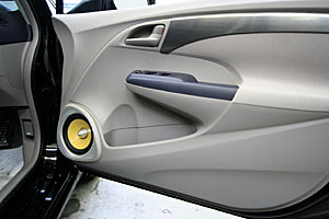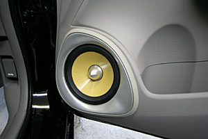 フロントピラーにツイーターをうめ込み処理、ドアアウター加工デザインでミッドスピーカーをインストール。トランクスーペースにサブウーハー、アンプなどをインストール。