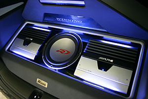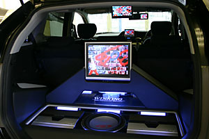 トランクスペースにはアンプ、サブウーハー、モニターをネオン管と共にインストール。その他には、フリップダウンモニター、ミラーモニター、インダッシュモニター。