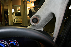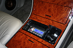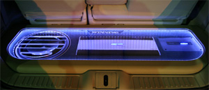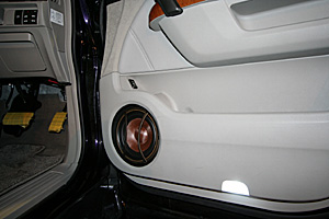 フロントドアにスピーカーをうめ込み、ツイーターもフロントピーカーを加工してうめ込み処理。コンソールの小物入れにプロセッサーのディスプレイをインストール。