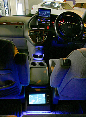 純正のマルチモニターをセカンドシート足下に移設して加工取り付け、フロントコンソールにインダッシュモニターやHDDナビをインストール。純正のマルチモニターにもナビ画面やDVD画像を楽しめて、純正機能もそのまま利用できます。