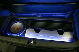 インダッシュ、グローブボックス、ミラーモニター、フリップダウン、ヘッドレストモニターと6枚のモニターをインストール。リアスペースには、サブウーファーとアンプをインストール。