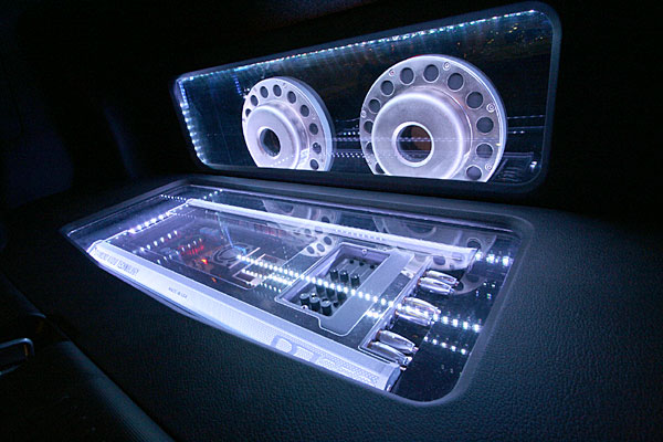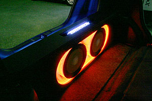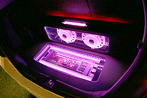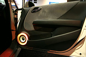 トランクスペースにサブウーハー、アンプをインストール。フロントスピーカーはドアにアウター加工、ツイーターはFピラーに埋込み処理。