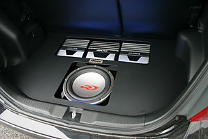 フロントコンソールにはモニターをうめ込み処理、新たにオリジナルでコンソールボックスを延長しヘッドユニット、プロセッサーをインストール。トランクにはアンプ×3とサブウーファーをインストール、ボードで隠せば荷物も乗せられます。