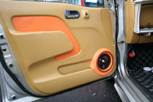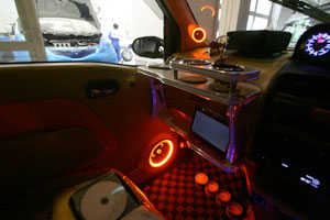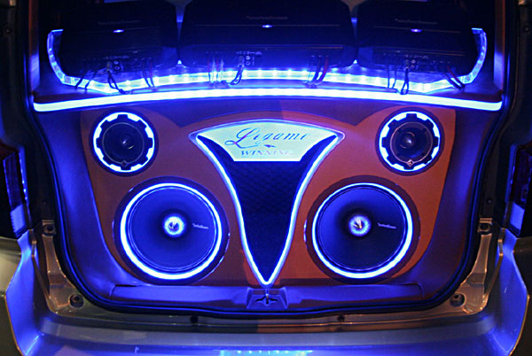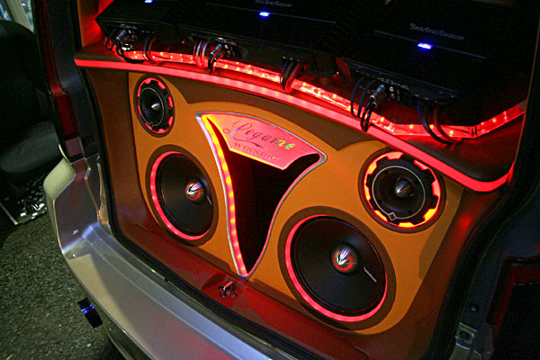 ラゲッジスペースにカスタムインストール。外向き仕様でLED&アクリルワークにより、オーディオ&ビジュアルでのインパクト大です。