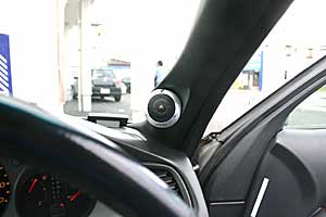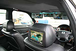 フロントピラーにツイーターをインストール。バイザー&ミラーモニター、そしてヘッドレスとモニターはうめ込み処理。