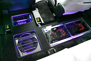 セカンドシートのフロアスペース、助手席下等を加工してインストール。アクリルとネオン管で仕上げられ、夜には非常に奇麗です。(アンプ、ウーハーの上にカバーボードを装着すればセカンドシートの乗車に支障有りません) Fスピーカーのツイーターはピラーへうめ込み処理をしています。