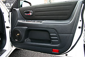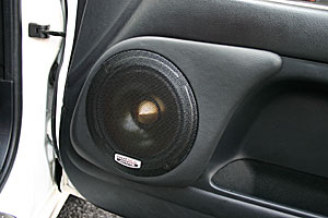 フロントAピラーにツイーターをうめ込み処理でインストール。ミッドスピーカーはドア純正位置を加工し、アウターバッフルを制作、インストールしています。