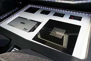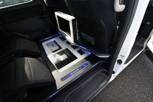 リアシートスペースにインストール。アンプやプロセッサーをLED&アクリルワークにてインストール。