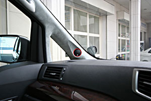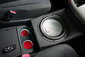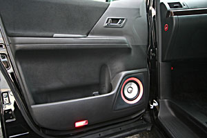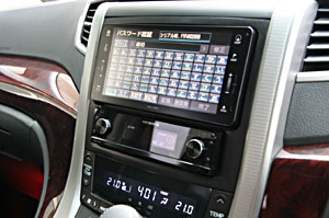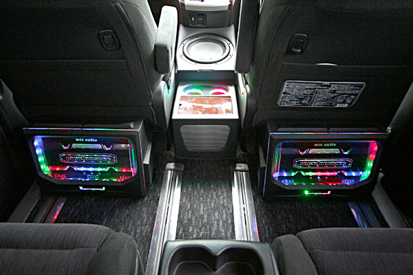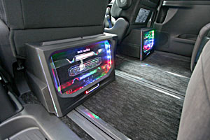 フロントコンソールパネルを加工して大画面ナビをインストール、センターコンソールにサブウーハーボックス。フロントミッドスピーカーはドアにアウター加工、Fピラーにツイーターを埋込み処理。