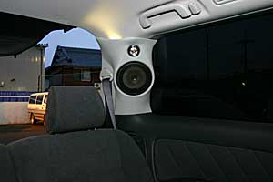 フロントスピーカー、ミッドはドア純正位置に取付け、ツイーターは純正位置を加工してインストール、リアスピーカーはピラーにワンオフでマウントを制作してインストール。 ラゲッジスペースにウーハー、アンプ、キャパシタなどをインストール。