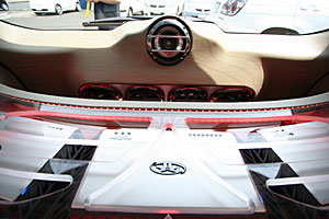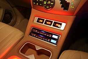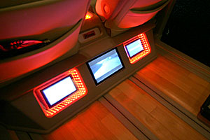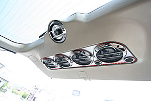 センターコンソールをワンオフ、メーター、デッキなど、、セカンドシートの足下にはモニターをインストール。リアゲートにスピーカーを追加。
