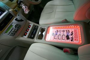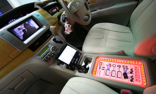 フロントセンタースピーカーをインストール。運転席前の小物入れにはデッキを埋込み。