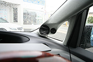 ハンドル前の小物いれに、デッキ&ETCを埋込み処理。ピラーにはツイーターとミッドレンジスピーカーをインストール。