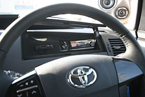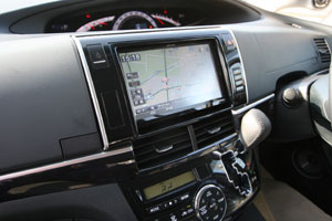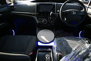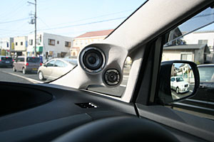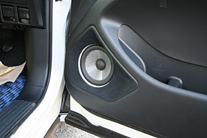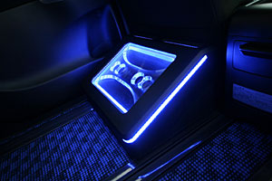 センターコンソールを加工して大画面ナビを埋込み、ハンドル奥の小物入れにもデッキディスプレイやETCをインストール。 Fピラーにツイーター&スコーカーを埋込み処理、ミッドスピーカーはFドアへアウター加工にて取付。 センターコンソールを延長デザインしてサブウーハーを取付け、セカンドシート足下にアンプをインストールしています。