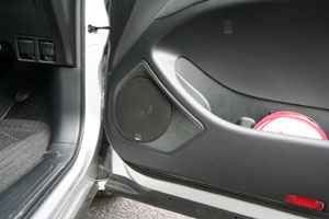 フロントドアにアウター加工にてミッドスピーカーを埋込み。ツイーターはFドアーミラーうらに埋込み
