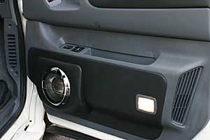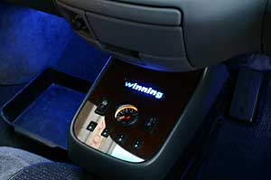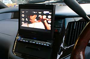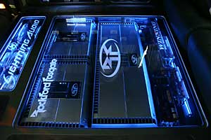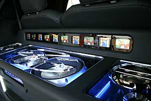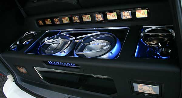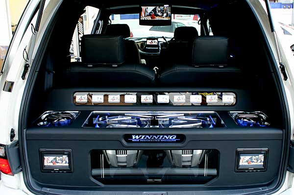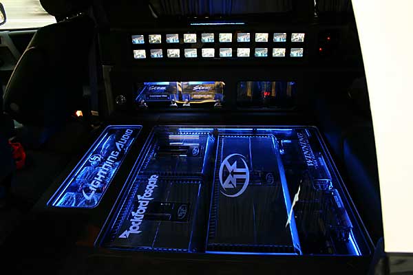 リヤセクション、、、ロックフォードのサブウーハー、リヤスピーカーBOXはアクリル&ネオン、3.5インチモニター×10と5.8インチモニター×2。