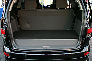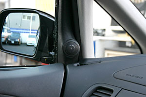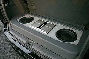 ダッジュボードにプロセッサ用ディスプレイ、小物入れにボルトメーターをうめ込み。ツイーターは純正位置を加工してインストール。 ラゲッジスペースのボードを外すと、サブウーハー、プロセッサーがうめ込まれたボックスが現れます。