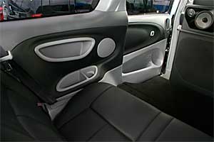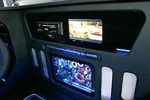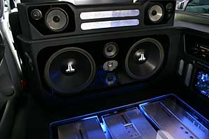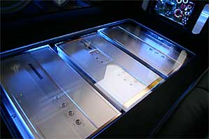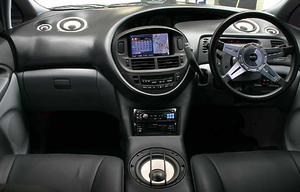リア部分はセカンドシート取り外してリムジン仕様に、大型液晶モニター、スピーカー、サブウーファーをインストールするパネルを製作、サイド部分にもモニター、DVDプレイヤー、アンプをうめ込み。床部分にはアクリル&ネオン管で演出してアンプ×3をうめ込み。