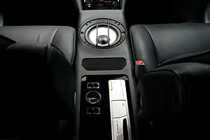 フロント部分はダッシュボードとコンソールをブラックレザー仕上げでワンオフ製作、ダッジュボード上にはFスピーカーをインストール、コンソールにはサブウーファーとチェンジャーをインストール。ダッシュボードからフロントドア、リアドア、シート、天上もブラックレザー仕上げに。