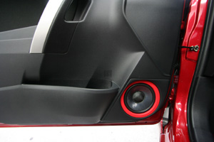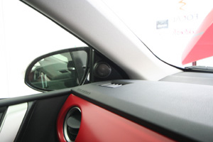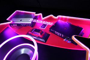 ラゲッシスペースにLED処理によるインストール、アンプやウーハー、プロセッサーなどを取り付け。フロントスピーカーはアウター加工、ツイーターはドアミラー裏にインストール。