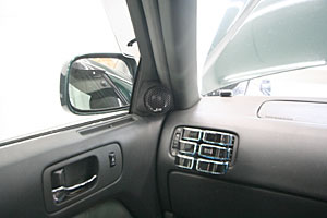 フロントドアをアウター加工でミッドスピーカ-、ドアミラー裏にはツイーターをそれぞれインストール!