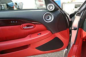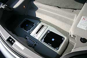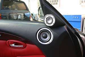 フロントコンソールを加工してデッキをインストール、iPod接続システムのモニターもうめ込みコントローラーは操作性の良い位置に取付けています。フロントスピーカー、3ウェイはドアにうめ込みでインストール。ラゲッジスペースにプロセッサー、アンプをインストール。(オープン時のルーフ格納にも問題ありません)