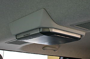 フリップダウンモニターを取付け、天井の形状にあわせて制作したオリジナルのベースを利用、全く違和感なく収まっています。