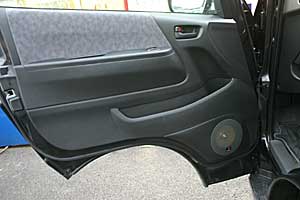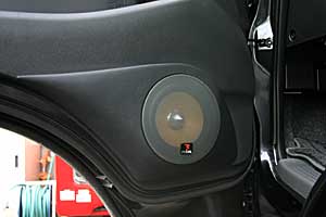 フロントピラーを加工してツイーターをうめ込み処理で取り付け、ミッドスピーカーはドア純正位置をアウター加工してインストールしています。