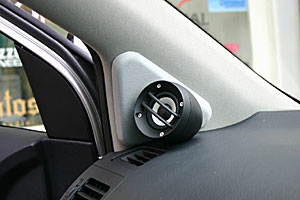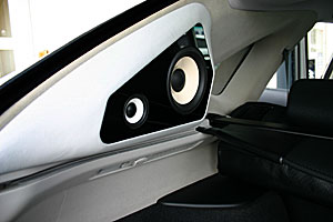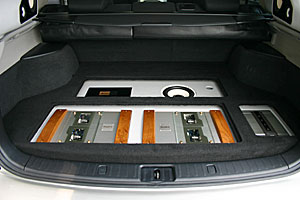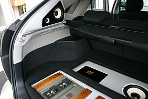 トランクスペースはストック風にサブウーファー、アンプ、プロセッサーなどがインストールされています。リアスピーカーはアウターバッフル処理で取り付け、本格的カーシアターも楽しめるシステムです。 フロントスピーカー、ミッド部は純正位置に、ツイーターは専用ケースを利用してフロントピラー付近にインストール。