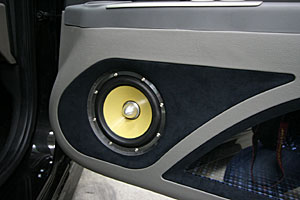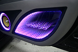 ドアスピーカーをネオン&アウターバッフルによるワンオフ加工。ツイターはピラーに埋込み&LED処理しています。
