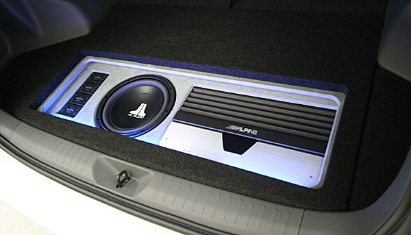 ラゲッジスペースにサブウーハー、アンプ等をインストール。ボードでフタをすると普段の荷物スペースの利用に問題有りません。