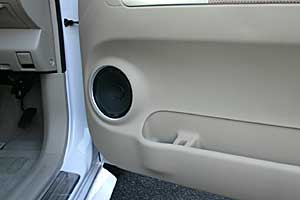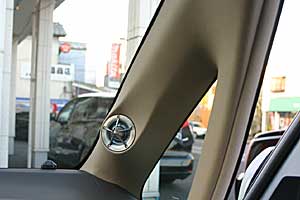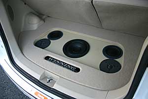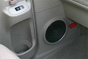 助手席のドアがスライドタイプのため、ミッドスピーカーは足下のキック位置にインストール。運転席側は通常のドアにうめ込みで取付けています。フロンピラーにはツイーターをうめ込み処理。 ラゲッジにはサブウーハー、リアスピーカーなどをインストール。荷物を乗せる時はボードでカバーすれば問題ありません。
