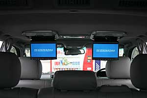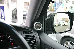 ドアミラー裏を加工してツイーターをうめ込みインストール、天井にフリップダウンモニター×2を取り付け。