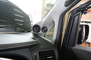 Fコンソールエリアを加工してサブウーハーを埋め込んでおります。また、Fピーラーにツイーター&ミッドレンジスピーカーをインストール、ドアにはミッドを取付けて3ウェイシステムになってます。