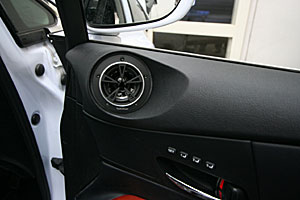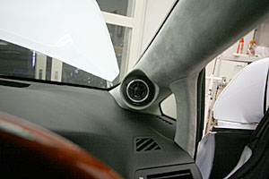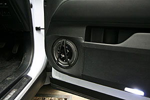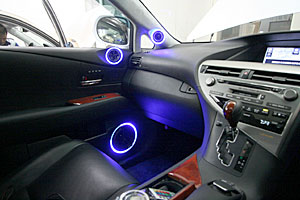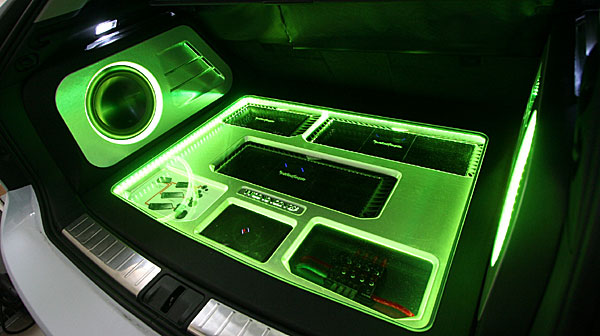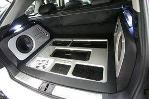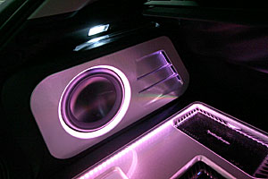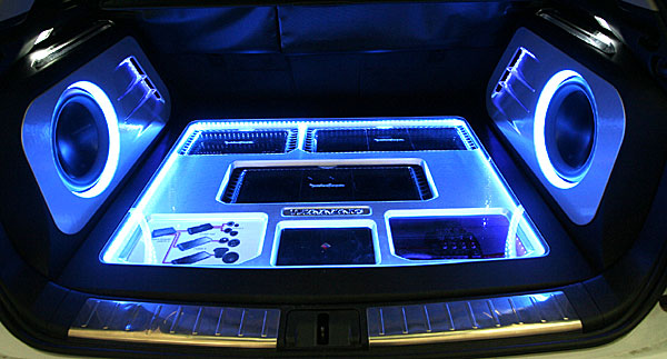 ラゲッジスペースにアンプ、サブウーハー、プロセッサーなどをインストール、LEDマルチカラーとアクリルワークで仕上げています。 Fピラーにツイーターを、ドアにスコーカーとミッドを埋込み処理にてインストールしています。
