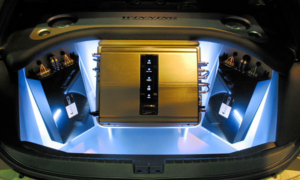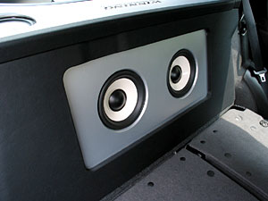 エアコン部を加工しセンタースピーカーをインストールしています。リアシートを折り畳むと、サブウーハー×2がインストールされ、リアスピーカーはリアトレー上部へ。