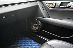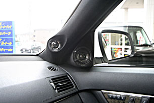スピーカーはフロントピラーにツイーター、ドアミラー裏にスコーカーをうめ込み処理。