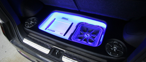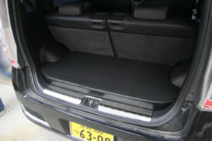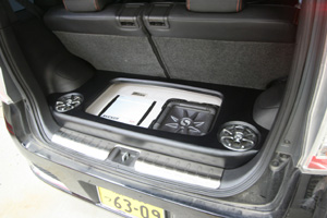 リアスピーカー、アンプ、サブウーハーをインストール。ボードで荷物スペースに問題が出ないようにしています。