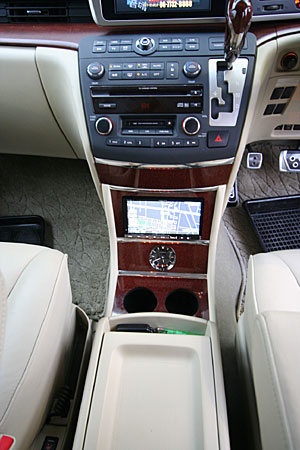 コンソールボックスワンオフで制作。モニター、時計などを埋込み、純正と繋げるデザインで仕上げています。