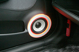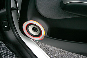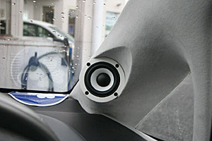 フロントドアを加工してミッドスピーカーをインストール。フロントピラーにツイーターを埋込み処理で取り付け。