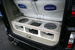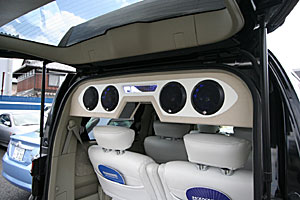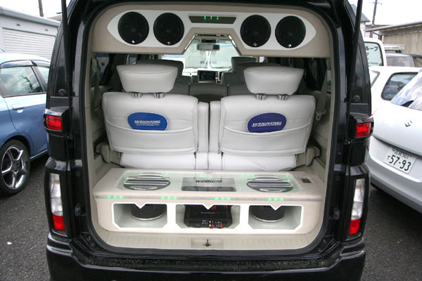 ラゲッジ天井にスピーカーボックスをワンオフ、ミラー&LEDで奇麗に仕上げています。