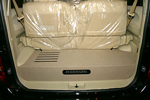 トランススペースの犠牲を最小限にアンプ、プロセッサ、ウーハーをインストール。ボード置けば荷物も乗せられます。