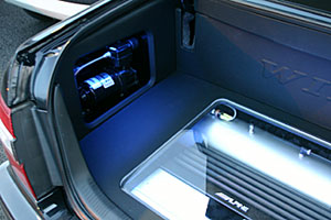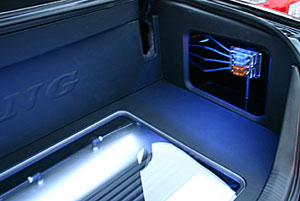 下面にアンプ、エアサス用タンク、左側にはエアサスコンプレッサーをレイアウト。