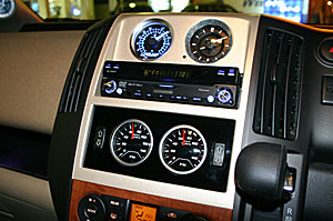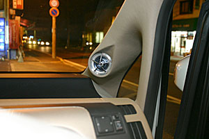 センターコンソールパネルをワンオフ、デッキの他にブルガリや電圧計、エアサスメーターなどがスッキリとインストールされています。 ドア純正位置にアウター加工でミッドスピーカー、ツイーターはピラーにうめ込み処理。