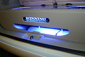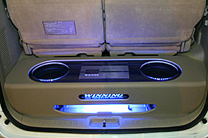 ラゲッジスペースはウーハー、アンプをインスール。そしてその下でネオンに輝いているのはエアサスのタンクです。