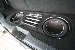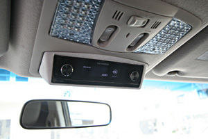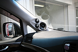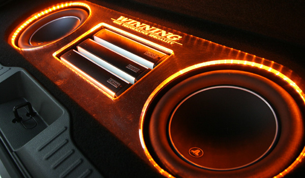 ラゲッジスペースにアンプ、サブウーハー、Rスピーカーなどをインストール、LEDとアクリルで演出しています。フロントスピカーはドア部分にミッド、Fピラーにツイーターとスコーカーをインストールしています。 デッキのモニター部分は運転席上部に、コンソール内に本体を埋込んでおります。